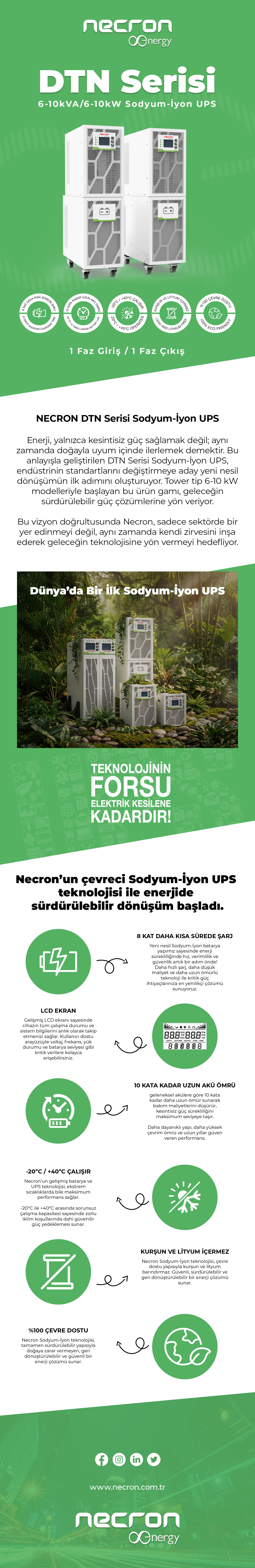 Enerji sadece süreklilik değil; doğayla uyum demektir, ana fikrinden yola çıkılarak endüstrinin standartlarını değiştirmek için geliştirilmiş ve bir dönüşümün sembolü olmaya aday ürün gamının Tower tip 6-10kwatt gücündeki temsilcisi UPS sistemi. 6-10kwatt online bir UPS sisteminin maliyetini düşürmek için tüm bileşenlerin opsiyonel olduğu endüstri alışkanlıklarının aksine kabin ölçüsü değiştirilmeden süper kompakt yapısı; Paralellenebilme, Dahili manual by-pass, giriş ve çıkış şalterleri, USB, RS232, EPO, SNMP slot, Extra charge kabiliyeti ve benzersiz BMS kabiliyeti gibi bir çok özelliği standart olarak sunmakta ve rakipsizliğini ilan etmektedir.